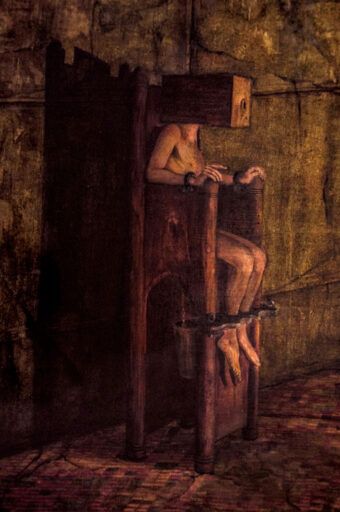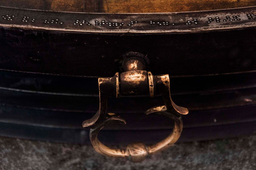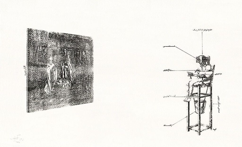 کار مشترک با شهریار حاتمی، درِ گورابهای برای اجرایی ناکرده، رنگ روغنی روی بوم، چوب، آهن، برنج، ۱۸ × ۱۴۵ × ۱۴۵ سانتیمتر. سنگنبشت: بریل انگلیسی شبیهساخته