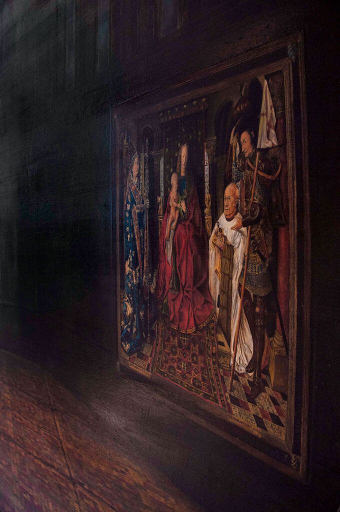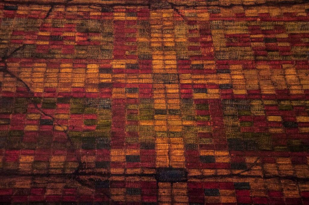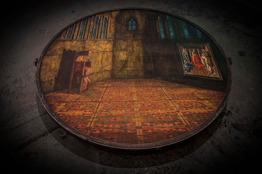 2008–2013, in collaboration with Shahryar Hatami, a crypt lid for an unrealised performance. Oil on canvas, wood, iron, brass, 145x145x18 cm. Epitaph: English imitation Braille