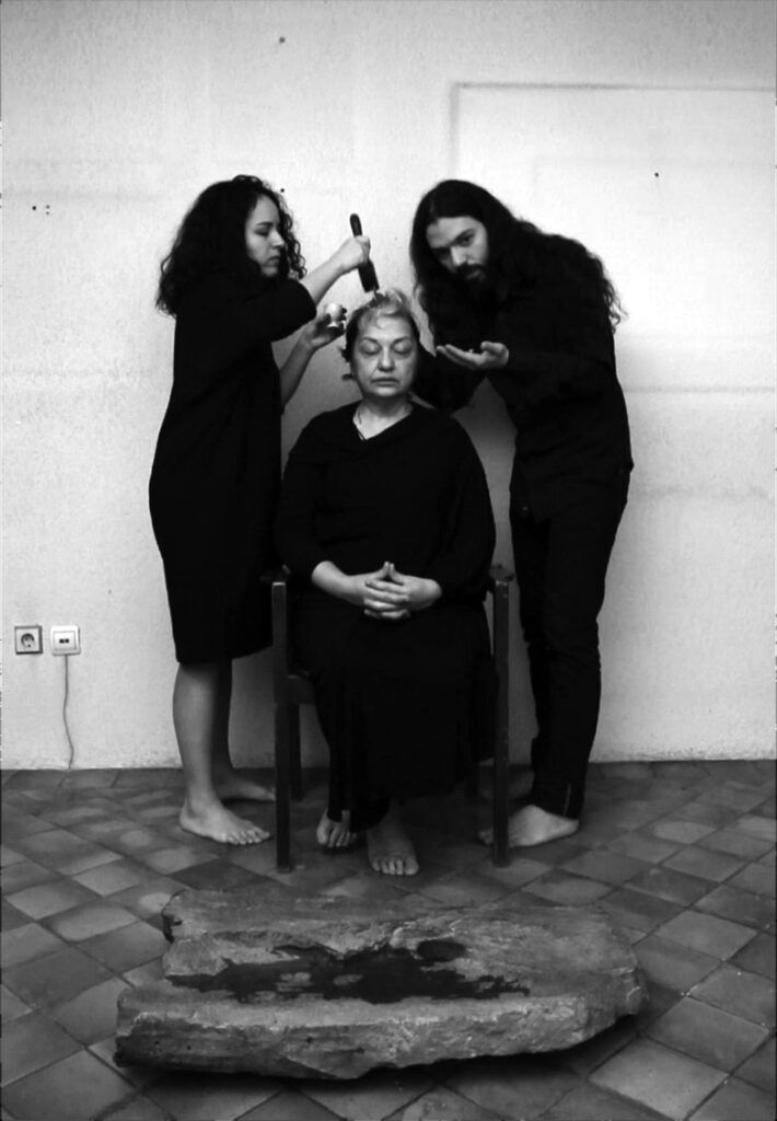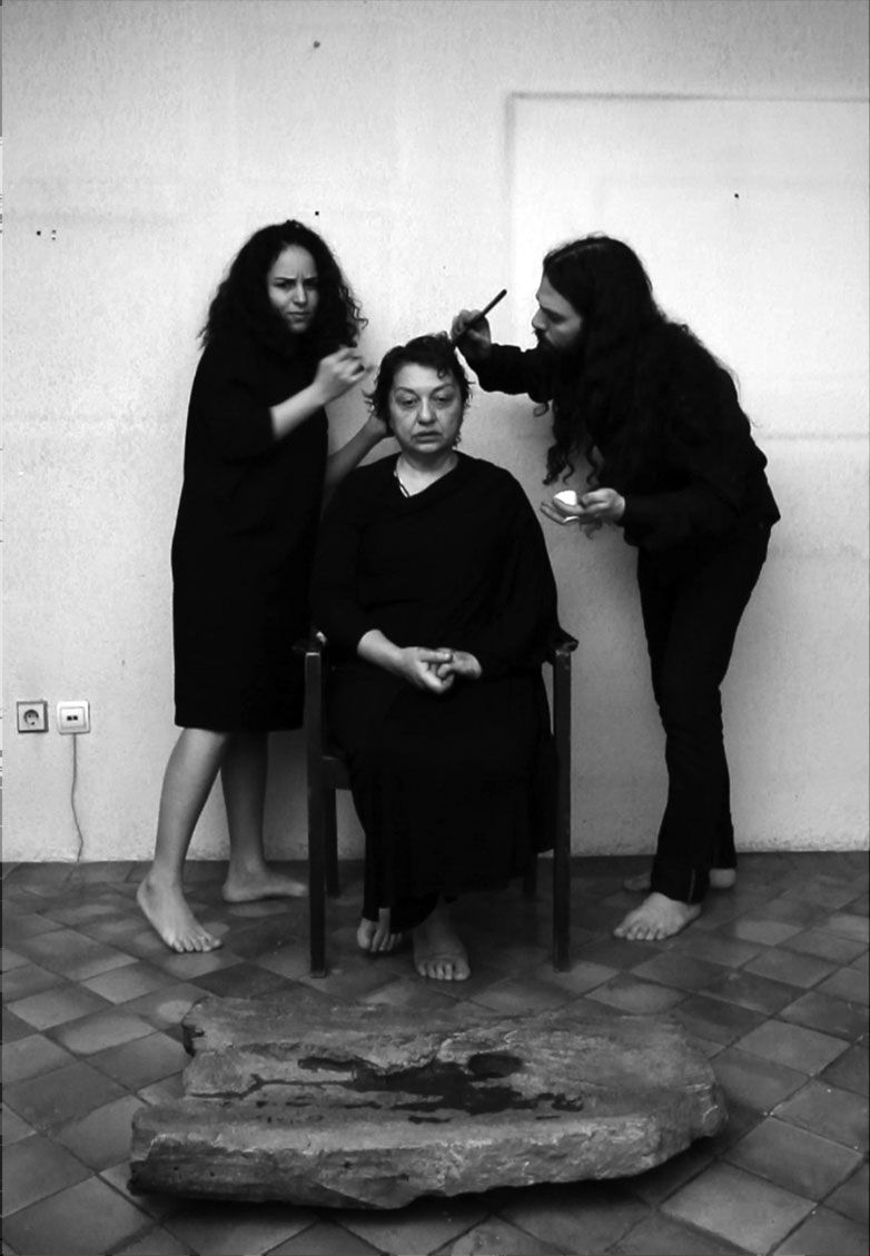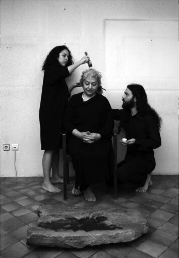 With Farzaneh Taheri, Ghazal Golshiri, the artist’s mother and sister and Houshang Golshiri’s tombstone in their house. The artist made this video before replacing his father’s vandalised tombstone with that of his own creation. The video refers to a quatrain by Roudaki (died 941): Not for this reason black my hair I dye / To look more young and vices new to try / People in time of grief don raiment black / I black my hair in grief at old age nigh.